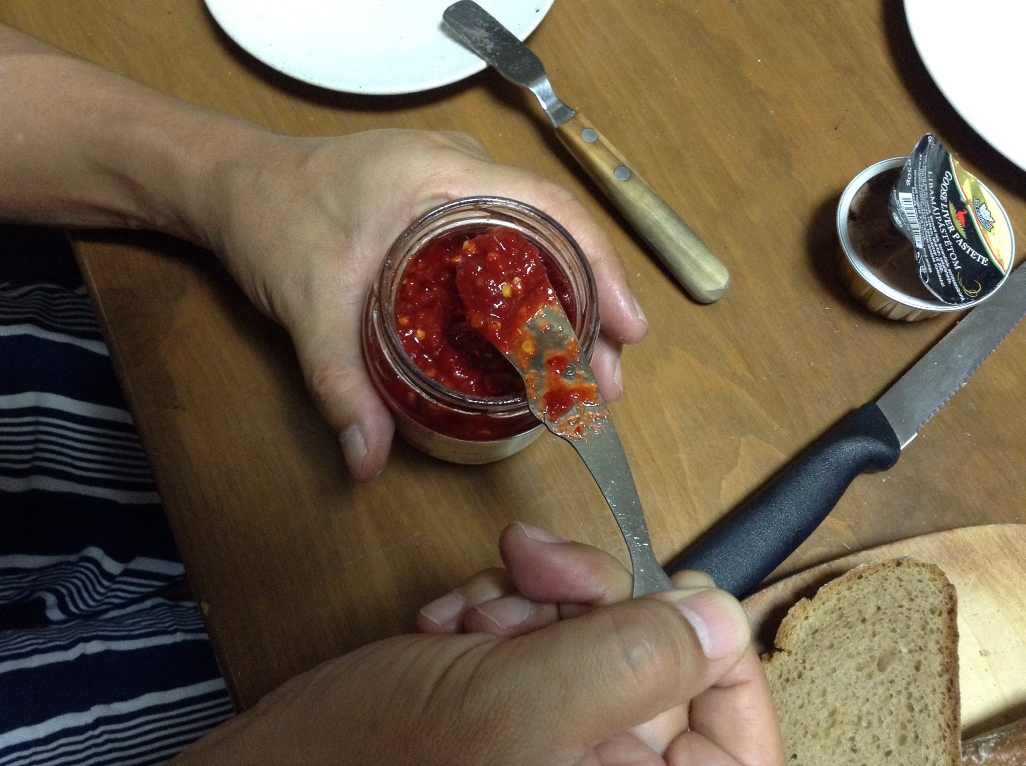 こちらは辛味の強いタイプですが、色はパプリカの鮮やかな赤で、味も香りもパプリカの青臭いフルーティーさがギュギュッと。コレをパンにつけたり、グラーシュにまぜたり…これは美味いわ。