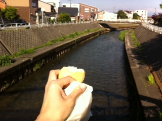 四ツ辻に気をつけるんだよ、といって別れたものの、何か手持ち無沙汰で、帰り道の「ヤマカワ」でアイスモナカの特大を買って橋の上で食べた。今日は立山が良く見える。