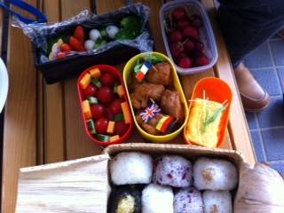 「タコさんウインナ、からあげ、おにぎり、アメリカンチェリー。ウルトラマンのハランに、ハタのようじ。」
