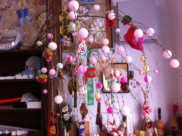 幼稚園に正月以来飾られていた,米粉でできた「まゆ玉」の中にクジが入っていて,引いた番号のお年玉(おもちゃ)が当たるのだ。ムネムネ。