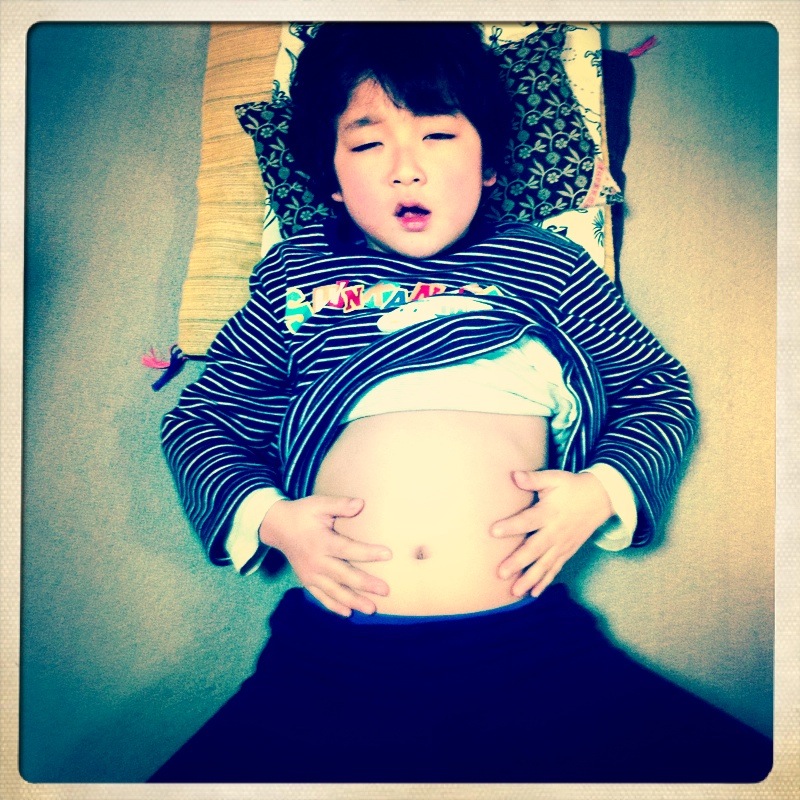昨夜から食い放題の少年の胃袋は,彼が心配するほど柔じゃないので,