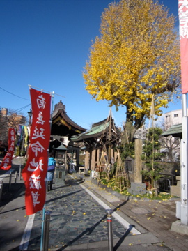 いたち川の随所に設けられた地蔵尊脇の銀杏が青空に映える。