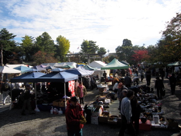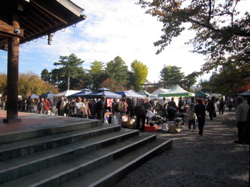 どこって?護国神社の青空蚤の市でんがな。しかも秋晴れの真っ青な高い空!こりゃ朝から縁起がいいや。