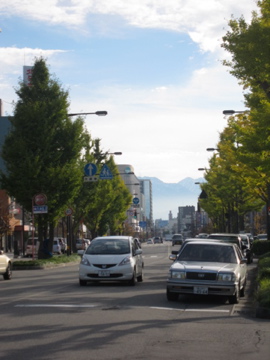 テクテクといたち川のたもとから,一本道の大通りをまっつぐ。テクテク。