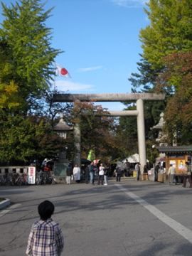 振り返れば真っ青な秋空に白く浮かび上がる立山連峰の雄姿,前をみりゃもうニッポンの旗がよく似合う護国神社だい。銀杏並木が黄色く色づいておる。これまた縁起がいいや。