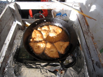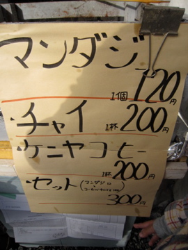 「マンダジ」というケニアの揚げパン。シナモンのベニエみたいな奴を,揚げたてハフハフ。旨いんだ,コレが。珈琲と良く合います。