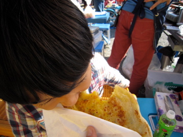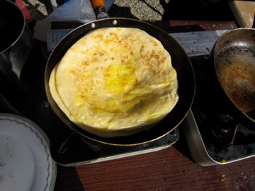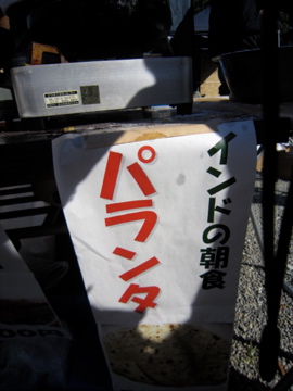護国神社でインドの朝食・・・。「パランタ」という一銭洋食。なにやらスパイスの香りが芳ばしい。勿論焼き手はインド人。インド人はノリが良くて好きだ。