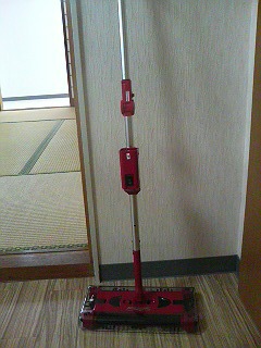従来品の改良機種で、いわゆるコードレスタイプの掃除機だ。スティック状になっており、形状はクイックルワイパーまんまなのだが、カートリッジ式の充電パックを装着させると、ウィーンと360度方向にブラシが回転し、ゴミをかきとりつつ吸い込む。無排気の上に、ゴミは片手でポンと捨てられ、ついでにヘッド部分はクルクル回転し、隅までキッチリ掃除するわ、重量一キロだわ、真っ赤なフェラーリボディだわ、卓上ミニ手動スイーパー付きで12800円だわ、おまけにあ~た、今ならスイブル・スイーパー本体をもう一組無料でサービスだわ。お客さん。