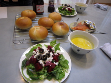 各自持ち寄ったものを広げて,焼きたてベーグルと一緒にいただきました。