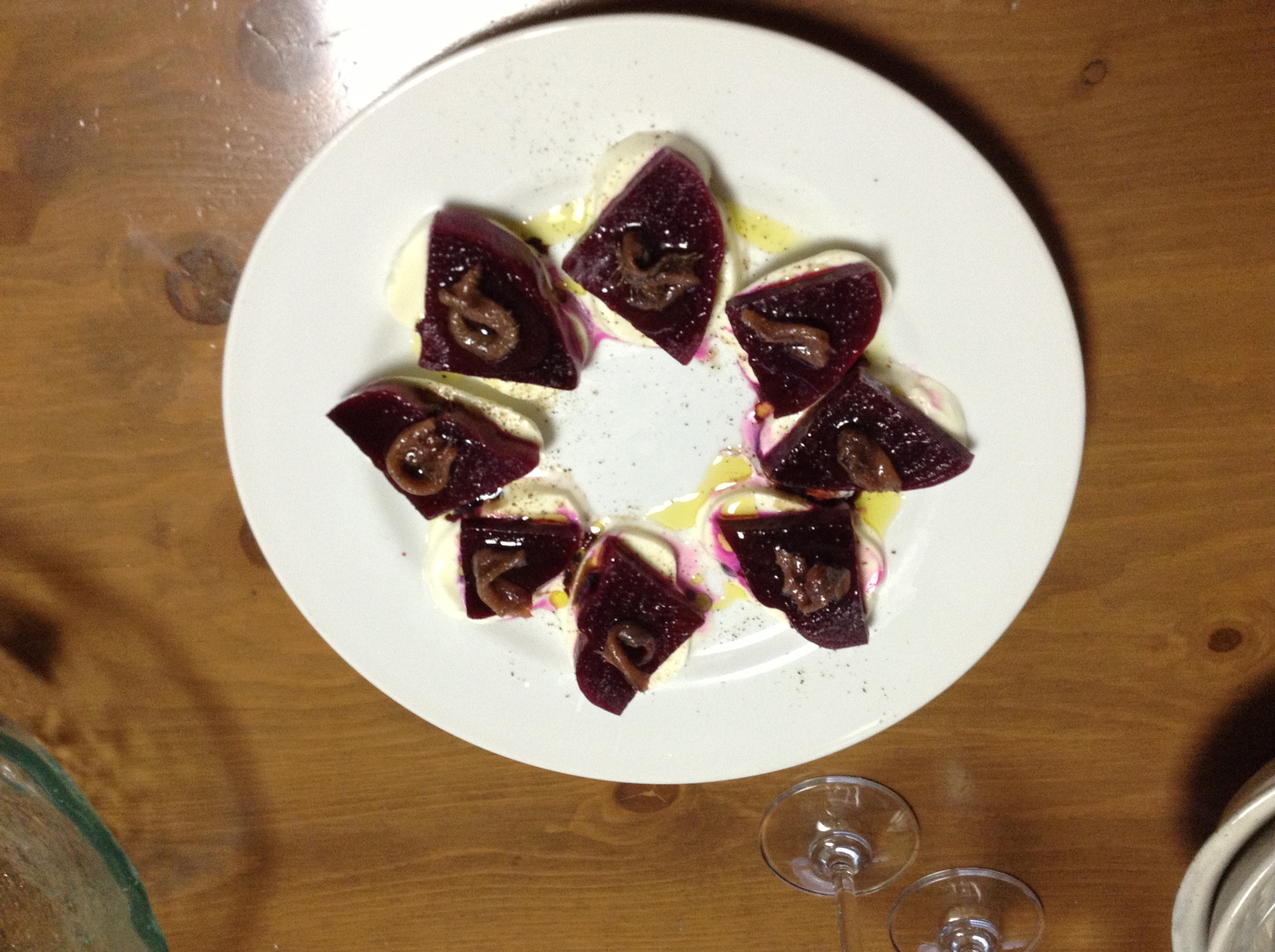 スライスした茹でビーツにモッツアレラ、アンチョビ乗せて、オリーブオイルと黒胡椒・バルサミコをふっただけ。ビーツ茹でる地獄(1時間)さえ超えれば、手間なしひんやり。