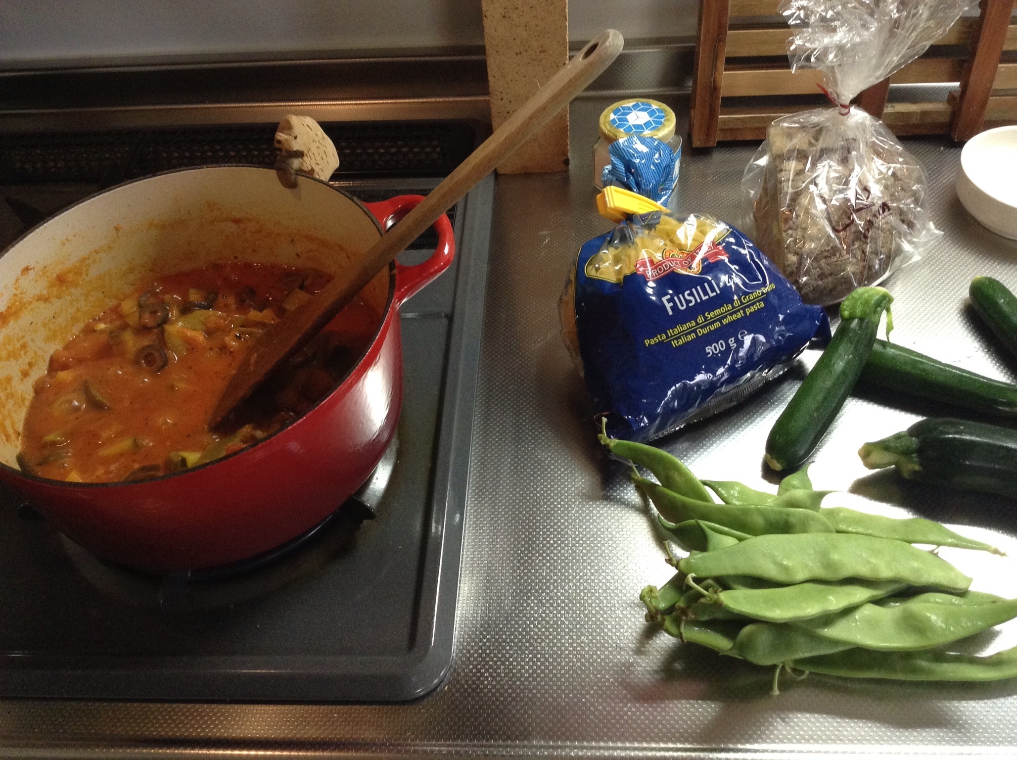 お山の畑でたんまり採れたズッキーニとナス、モロッコインゲンをどっさり入れて、トマトとアンチョビ・ケイパーと黒オリーブで煮込む…って、プッタネスカなのかカポナータなのかどっちやねんッ!!!!!ま、とれとれ旬だからヨシ。ペンネが品切れの為、フッジリで代用。黒パンと合うかなーーーー。すっかり夏っぽい、今夜の晩餐。梅雨明けまであと僅かか。