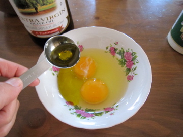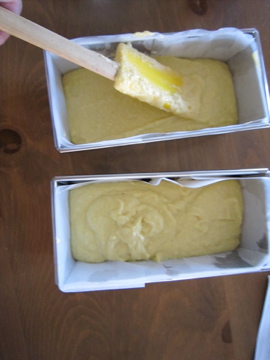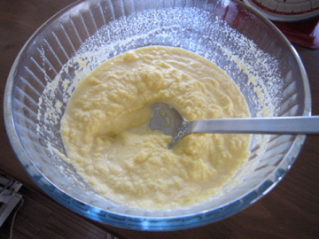 卵にオイル(今回はオリーブ油を使用したが,サラダ油のほうがコーンミールには合うみたい)をよく混ぜたものに,ふやかしたコーンミールを良く混ぜ,そこにふるった粉モノをサックリ混ぜ込む。