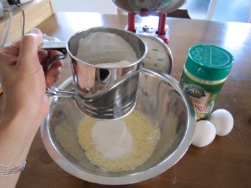パルメザンチーズに砂糖を混ぜたものにベーキングパウダーと,コーンミールと同量の薄力粉をふるい混ぜる。