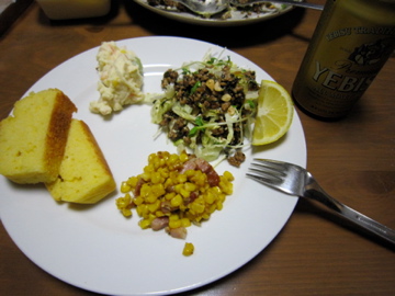コーンブレッドと一緒に,コーンとベーコンのソテーを口に運びながら,