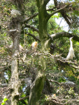 巣をみると,なんかコウノトリ系にも見える。こんな巣が50近くある。壮観。