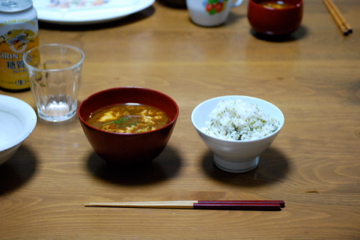 薫り高い野芹は塩をいれたお湯でサッと茹で,微塵に切ってごま塩と一緒に炊きたてご飯に投入。芹ごはんと,山三つ葉の卵とじ汁。