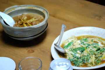 残りのススタケは,お揚げと鶏肉で味噌だれで煮込む。