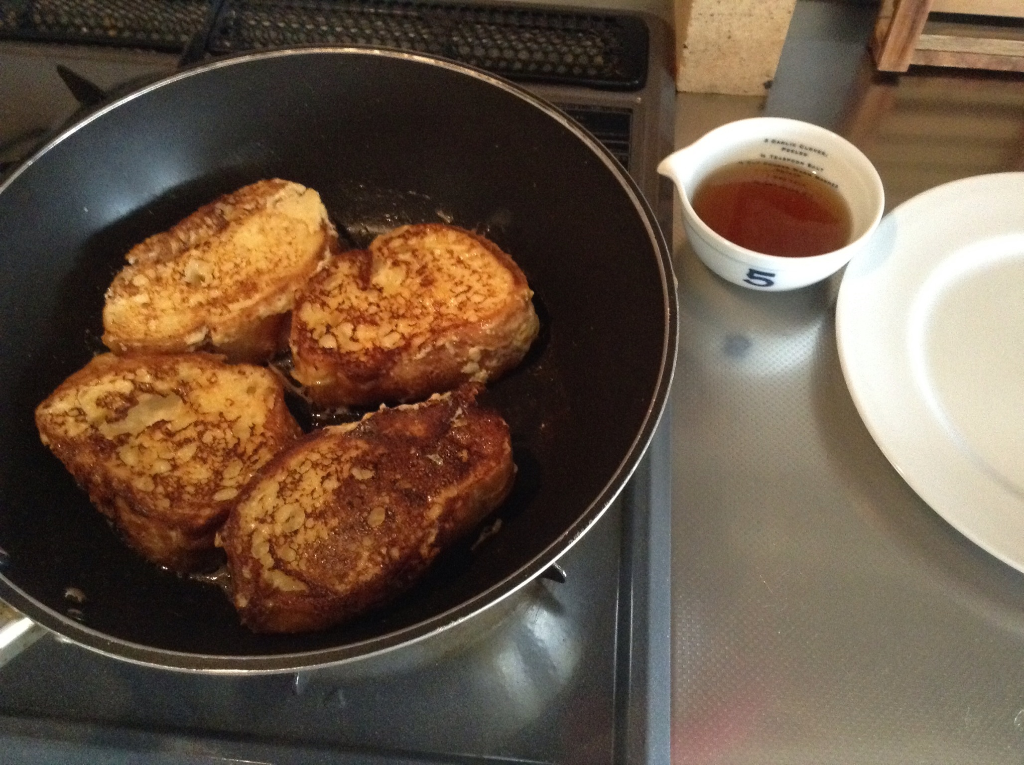 固くなったバゲットでフレンチトースト、樹液(シロップ)は三温糖で作ったお☆