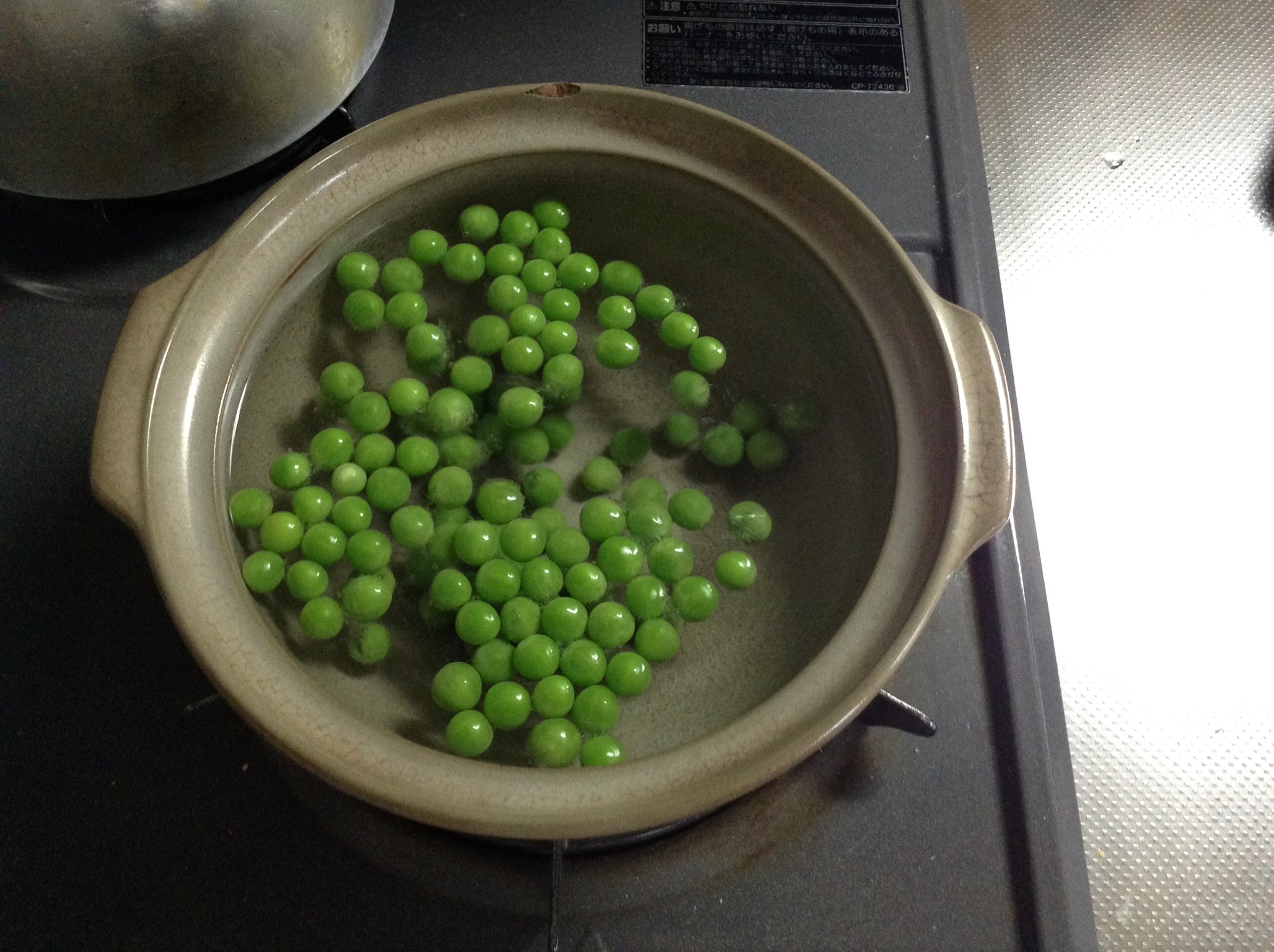 塩茹でされるグリーンピースちゃん。茹だると一匹(?)づつポクンポクンと浮き上がってくるのが、調理の際のお楽しみポイントかと。