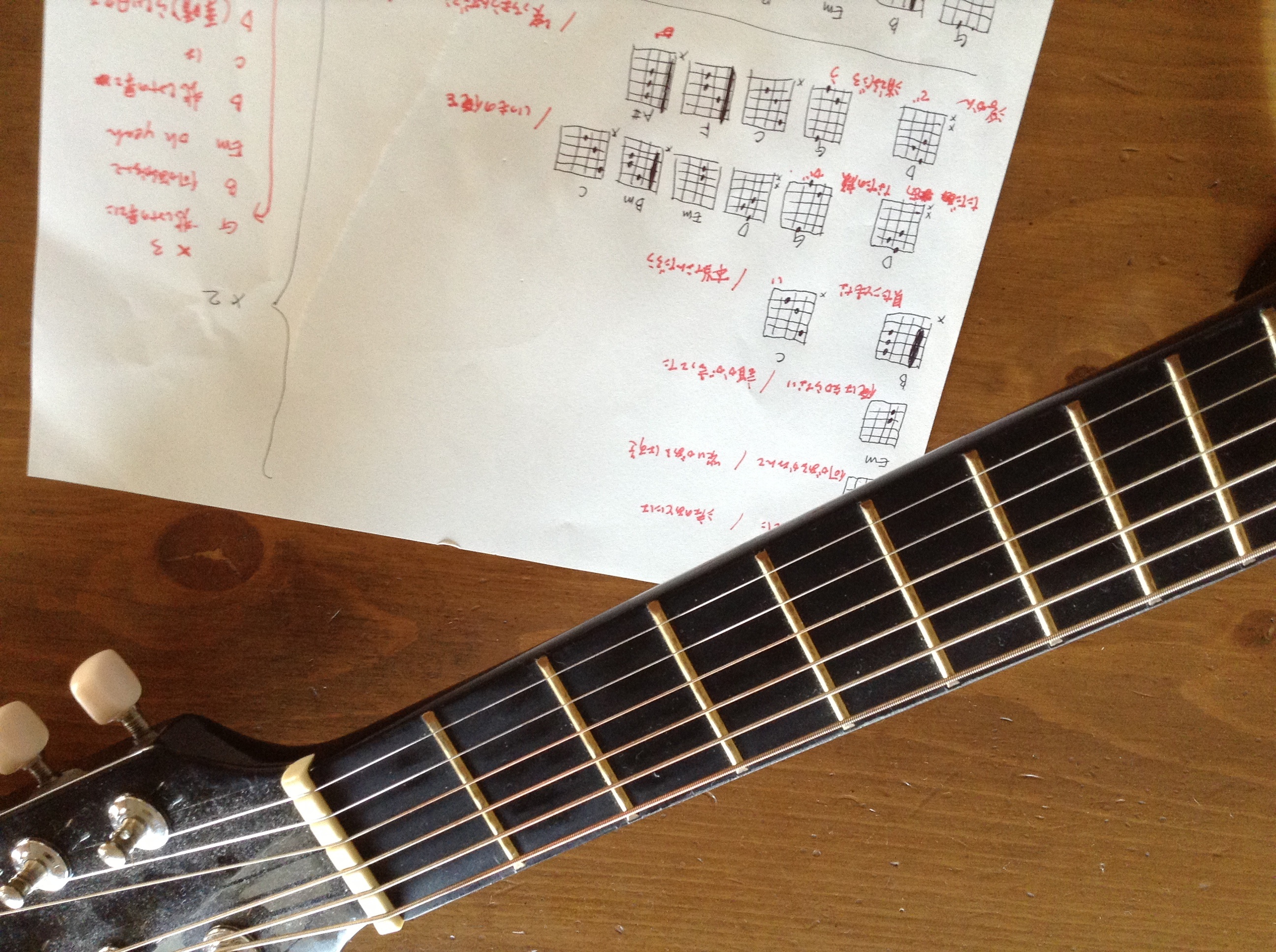 涙ぐましい手書きのコード表も先程完成。コレでネット接続出来ずともギター練出来る…(本買え)。