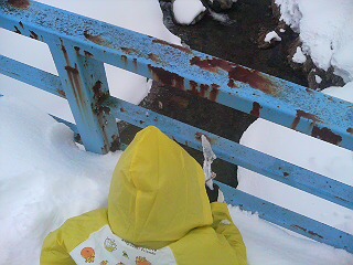 途中の橋の上から,岩魚を探す。去年はこの時期,橋の下にはウヨウヨ旨そうなのが泳いでたんに,今年はサッパリ。早く解禁になれ。早く食べたい。