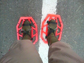 本物のかんじきは,村のまたぎの仙人が作ってらっしゃるが,プチアウトドア派の我等には,この一組900円・鶏のマークでお馴染みル・コックじゃねぇ,コメリで購入した簡易かんじきで充分だ。軽いし。