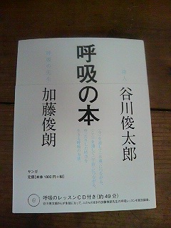 詩人の谷川俊太郎氏が,呼吸法の先生・加藤俊朗氏と対談形式でめくるめく呼吸ワールドに迫る。なんと呼吸が「今」と「永遠」,「此処」と「宇宙」をつなげてしまうところまでを解き明かし,更には宗教観・哲学感を絡めつつ,無意識の生命活動を自我のところまで引っ張りこむ。行き着くところまで行ったな,呼吸よ。