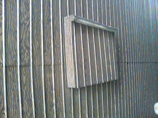 木目風トタン壁に,同素材の化粧がほどこされた庇。その下にはやはり同じようにカバーされている無用窓が,雨露からそっと護られている。