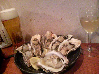 狭いカウンターに捻り込み、迷わず焼牡蛎に檸檬を絞って白ワインとビールで頂きま~すッ!