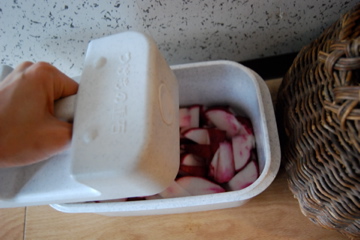 その水分を洗わず切って,砂糖100㌘と酢1カップで漬け込む。真っ赤になったら食べ頃だ。早く食べたい。