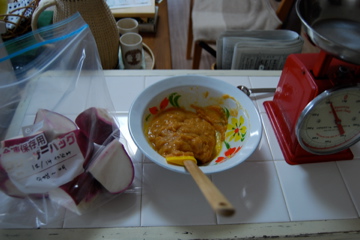 水気を切った赤蕪2個を四分の壱〜半分に切って,そこに味噌240㌘・酢45cc・白砂糖80㌘を合わせたのんを袋の中で絡める。