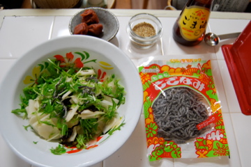 水気がでてきたら切って,そこに叩いた梅と白いりゴマ,胡麻油をチョロっと。