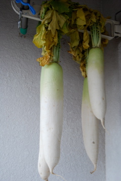 大根は葉付きのまま収穫して,軒下に干して漬け物になり,長く白い冬の間の貴重な保存野菜になります。