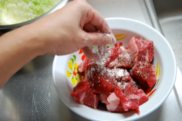 肉に塩こしょう小麦粉を振ってまぶしたんを,サラダ油とバターで焼く。
