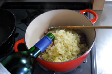 そのままのフライパンに,メッタ微塵切りに処したタマネギ(浅田次郎読んだのかと思うくらい今日は泣いたよね),セロリ,にんにくを投入。
