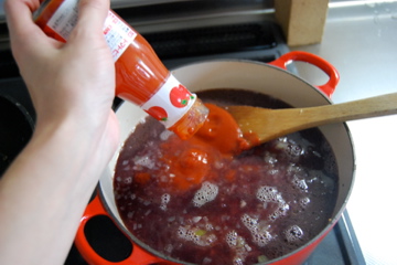 鍋に焼いた肉と炒めた野菜をぶち込み,スープ・飲み残しのワイン・ローリエ・トマトピューレを投入。