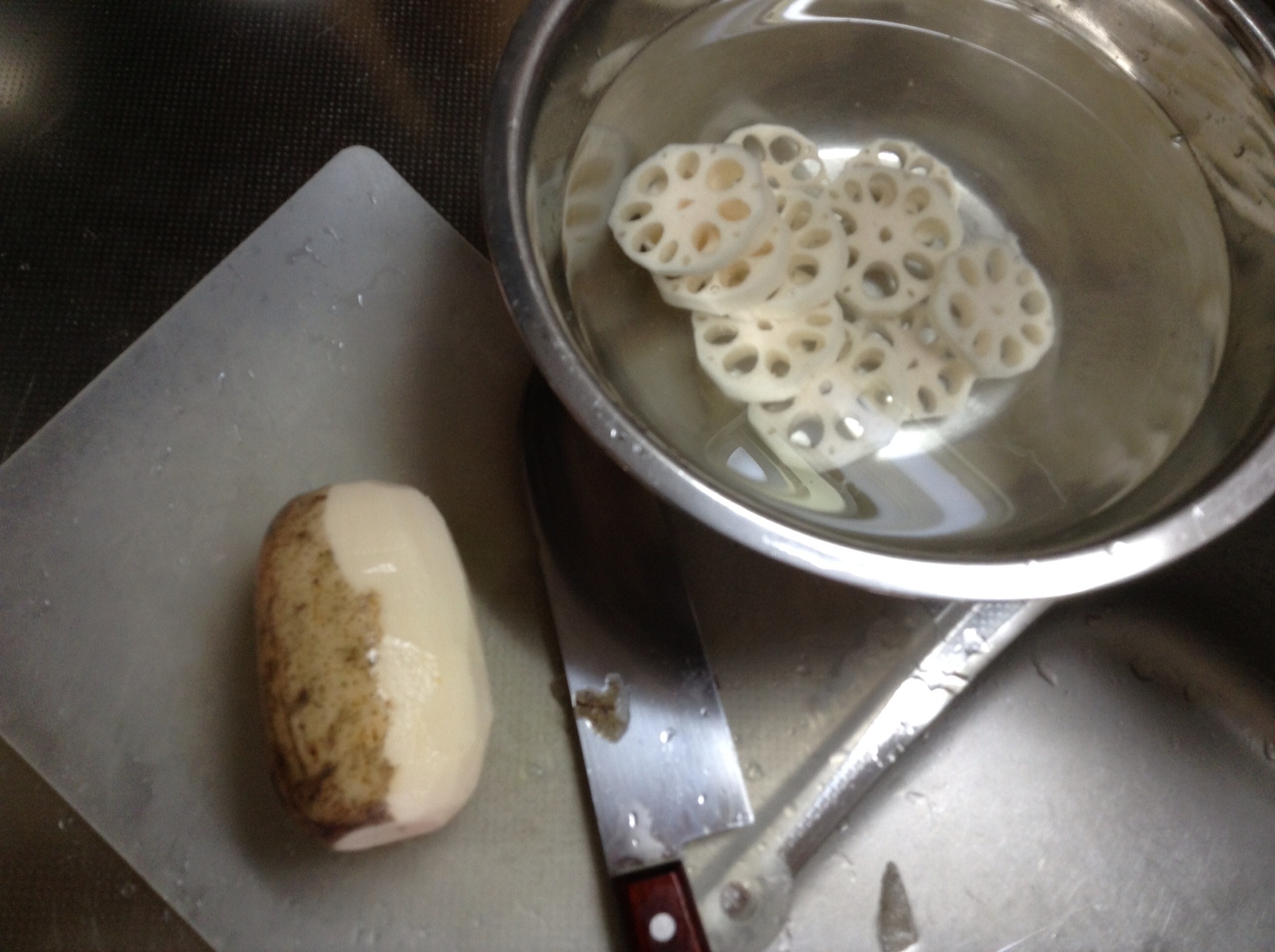 加賀蓮根は、薩摩芋と鳥肉と共に片栗粉をまぶして揚げ焼きしたのんを