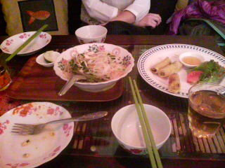 シンハービールに合うのは、青いパパイヤのサラダに、ベトナム風お好み焼き・バインセオ!野菜たっぷり包む皮は、米粉と卵とココナッツミルク。ジャブジャブニュクマムかけて、いただきまあす!