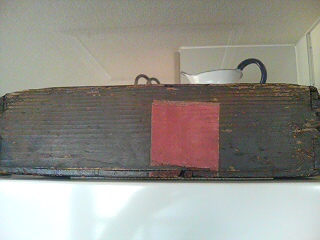 ふと見上げると,気に入って買った古い木箱にも,どこぞのどなたさんかが手当てしたと思われる痕跡が。