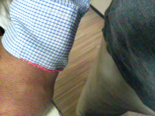 手首がパックリ割れたシャツを赤い糸で手当て済み。