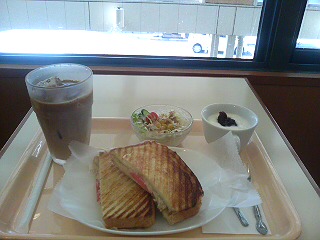 どうですか!カフェラテとホットプレスサンドとサラダとヨーグルト付きで、550円なんだ!