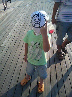 最初頭に被せていたのだが、目立ちたいらしく、顔に被せろと申す。