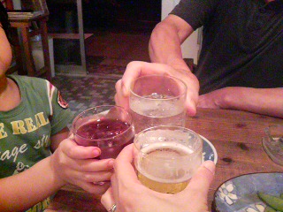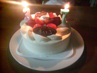 真っ白な丸い苺ケーキの上には、バースデーガールの名前とキャンドルが光ってる。お誕生日~♪おめでとう~♪と歌う男二人。