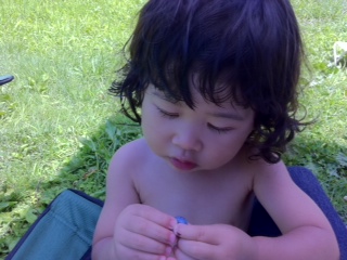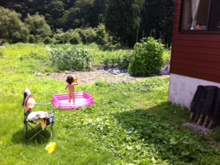 兄貴が狩ってきた、お山で今旬のブルーベリーに喰らい付く幼女(もうすぐ二歳、何故裸…)。