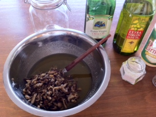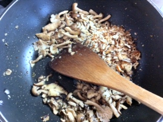 オリーブオイルで微塵にしたニンニク一片とシメジ・スライスしたシイタケを弱火でジックリ炒める。