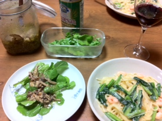 同じく頂いた小松菜で小エビと合わせたクリームパスタと一緒に(貰いもので育つ)。