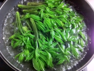 で、茹でる。色が蛍光グリーンに変わる瞬間が、山菜調理のお楽しみポイントだと思われる。