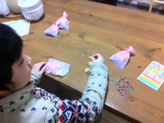 用意したブツをいそいそと袋詰めする伊達男(全部義理返し)。