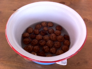 頂き物の山胡桃。水に一昼夜つけております。