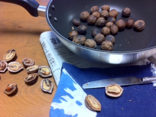 殻に隙間があいてくるまで、ひたすら煎る。口があいてこないのは、貝と一緒で中身が死んでいるからだそうだ。なんて賢いの、胡桃の奴。
